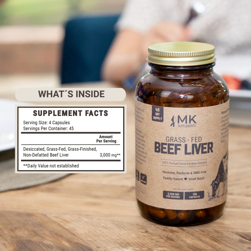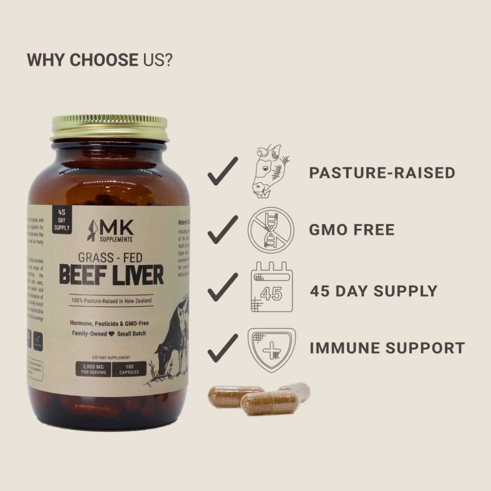 MK Supplements' Grass-Fed Beef Liver is from 100% pasture-raised New Zealand cattle. Unlike other manufacturers, we use a gentle freeze-drying method to turn fresh liver into a powder before filling it into gelatin capsules.