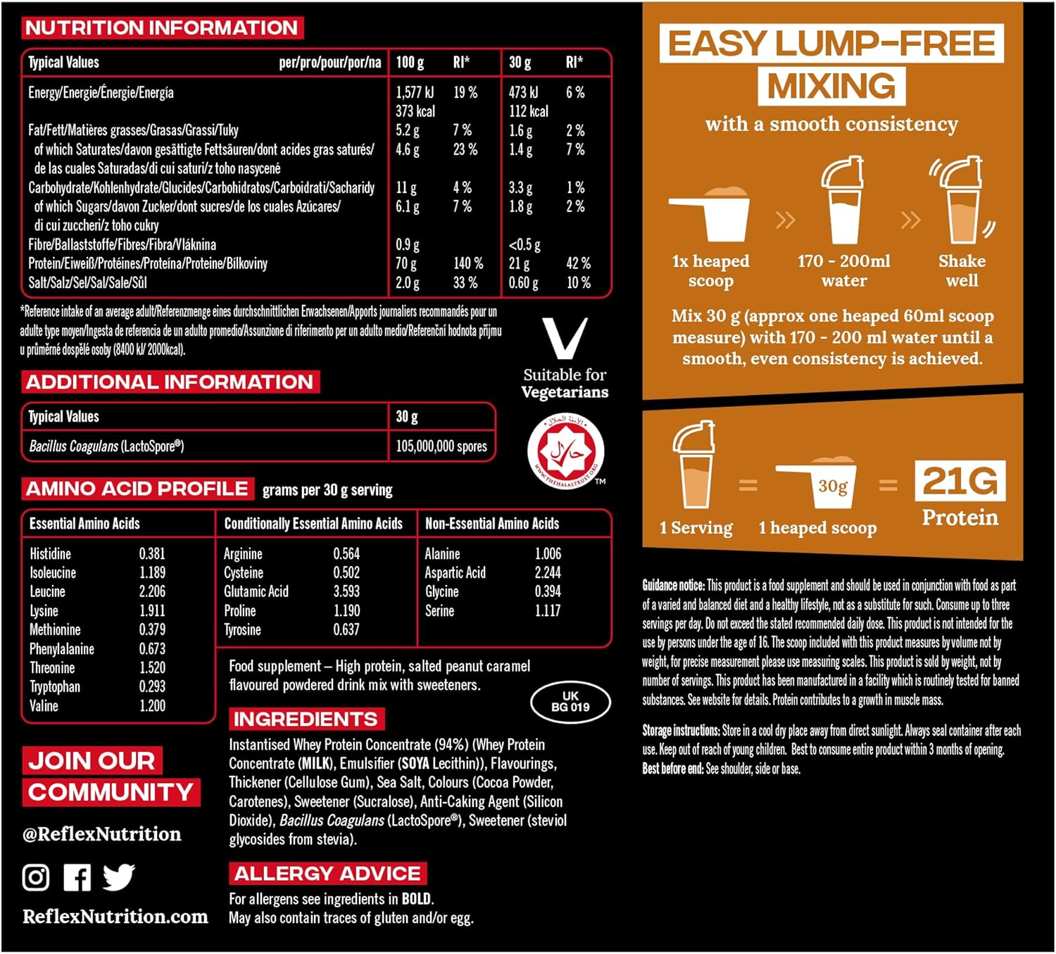 Manufactured in an informed sport registered facility: Reflex 100% Whey protein supplement is vegetarian-friendly, Halal-certified, free from hormones, and with no added sugars, artificial colours or soy protein - Contains soy derivatives